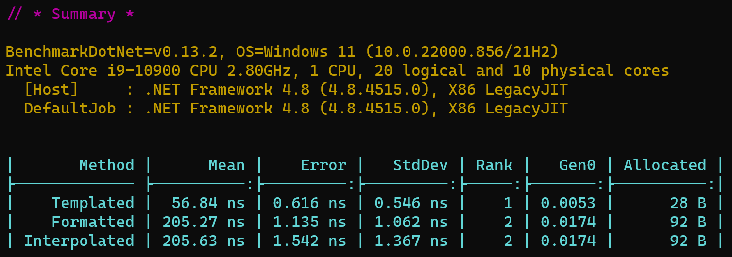 It turns out message templates are a thing. It sounded interesting, so I got curious to check what the performance would look like compared to interpolated string formatting (my current default way of string formatting).
